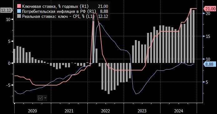 Рост инфляции выше прогноза ЦБ, слабость рубля и все еще сильная динамика кредитования заставят регулятора продолжать ужесточение ДКП. Банк России повысит ключевую ставку до 23% годовых на заседании в пятницу, считают аналитики SberCIB Investment Research. С момента предыдущего заседания Банка России экономическая ситуация развивалась хуже ожиданий регулятора, и в SberCIB считают повышение ставки почти неизбежным. Эксперты выделяют несколько причин: Настоящее сообщение содержит мнение специалистов инвестиционной компании или банка, полученное Интерфаксом. Такое мнение предоставляется исключительно для целей ознакомления и не является рекомендацией для покупки, продажи ценных бумаг, принятия (или непринятия) каких-либо коммерческих или иных решений. За содержание сообщения и последствия его использования Интерфакс ответственности не несет. MarketSnapshot - ProFinance.Ru в Telegram Россельхозбанк рассказал, как сильно ЦБ повысит ставку в эту пятницу Греф предсказал курс рубля Тремасов: у