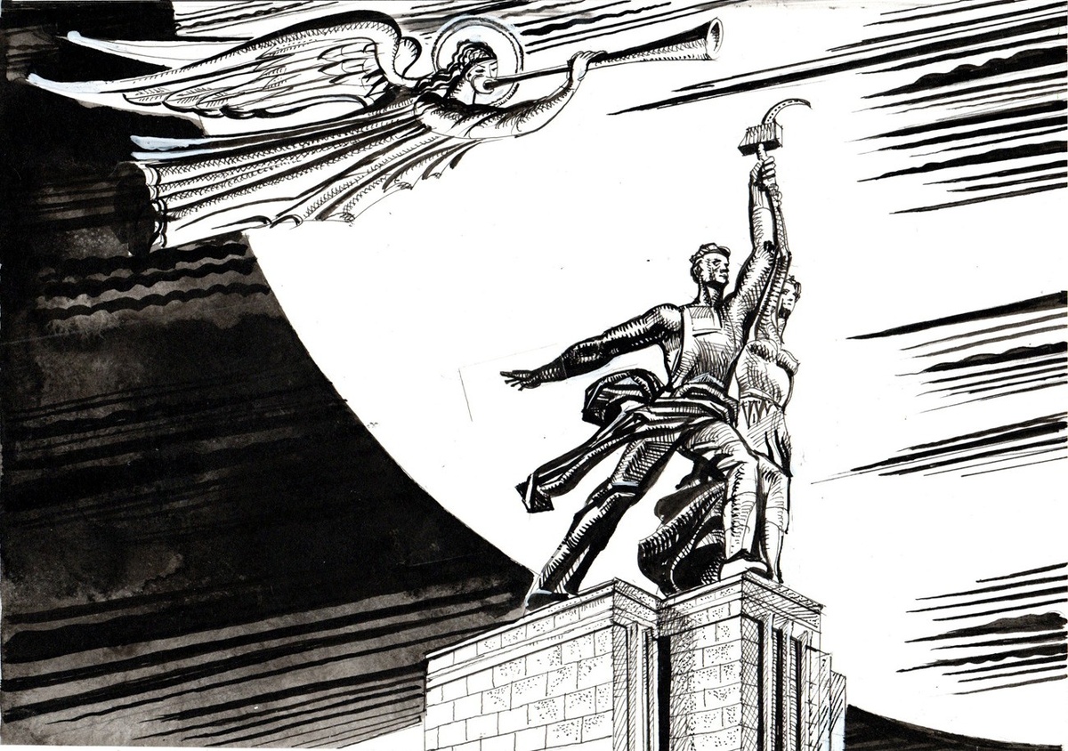 У труда были свои религиозные праздники: День сталевара, День хлебороба, День учителя, День танкиста. У этой религии были свои каменные иконы: скульптуры сталеваров, лётчиков, крестьянок с хлебными снопами, академиков с книгами. У этой религии были свои подвижники, герои, мученики. Был свой храм труда — Выставка достижений народного хозяйства. И был бесподобный символ: мистический памятник Мухиной "Рабочий и колхозница". Это были Адам и Ева, когда-то изгнанные из рая с божественным напутствием: "Идите и в трудах добывайте хлеб свой". И теперь они, пройдя земную историю и сотворив рай земной, возвращались в рай небесный, показывая Господу орудия труда, которыми был сотворён этот рай, — молот и серп.