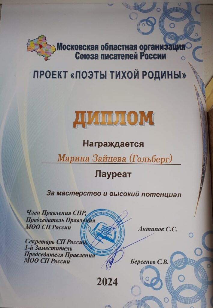 За мастерство и высокий потенциал была награждена Дипломом лауреата академик ИАСК Зайцева-Гольберг Марина Дмитриевна Московской областной организацией Союза писателей России.