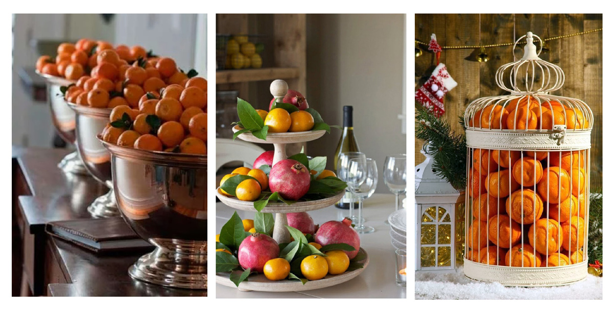 Начну с самого популярного продукта, который однозначно ассоциируется с Новым годом - мандаринами. Покажу пару картинок как прекрасно смотрятся эти цитрусовые в интерьере, если использовать для хранения интересные ёмкости. Это могут быть вазы-фужеры на ножках, декоративные клетки, ведёрки и даже аквариумы. Лучше покупать мелкие мандарины с листочками. Они и в интерьере будут всегда смотреть беспроигрышно и симпатично заполнят пустое место в коробочках с подарками.