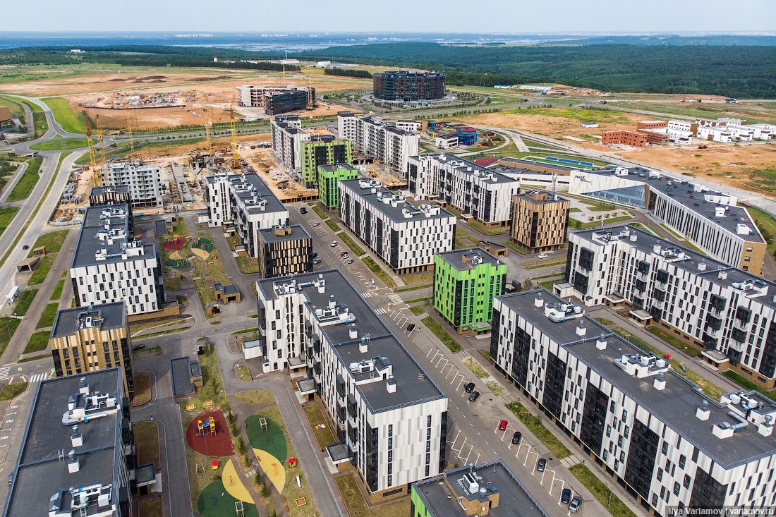18. Вид сверху. Построено еще очень мало. Но тут хорошо видно бестолковое планирование. Широченные дороги, вдоль дорог какие-то пустыри, которые никому не нужны, их нельзя использовать, потом парковки. Все очень рыхло, ощущения города нет.