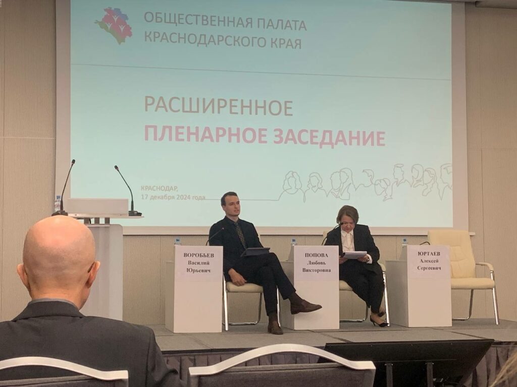 В рамках пленарного заседания Общественной палаты Краснодарского края во втором блоке докладчики посвятили теме развития бизнеса и сотрудничества с некоммерческими организациями. Руководитель департамента развития бизнеса и внешнеэкономической деятельности Краснодарского края Василий Юрьевич Воробьёв выступил с докладом о достижениях региона в экономической сфере.
