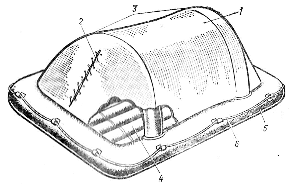 Немного о том, что представлял собой плот ПСН-10. Морской надувной спасательный сбрасываемый плот ПСН-10 когда-то применялся в спортивном самодеятельном туризме достаточно широко. Общий вид такого плота показан на рисунке. Условные обозначения: 1 – тент; 2 – вход под тент; 3 – надувные опоры тента (дуги); 4 – дно надувное; 5 – борт надувной; 6 – леер (обвязка).