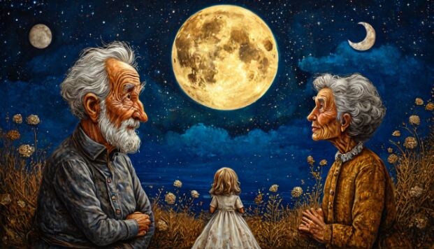 2. Почему плачут Дед и Баба? Луна закатывается (Солнце также в сказках катится по небу), ночная жизнь созвездий заканчивается? Или Луна исчезает за горизонтом на несколько дней в астрономическом смысле? Однозначно только то, что Дед и Баба живут на ночном небе.