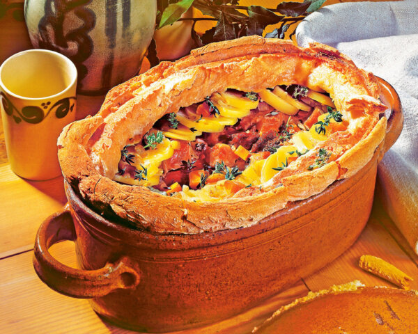 Вот мы сейчас большой ложкой да по этому рагу... Правда пока не разобрал что интереснее: готовить его или есть. Раньше рецепта в подобном исполнении я не встречал и мне он показался весьма интересным, причем даже каким-то особенным. Впрочем, прочтете рецепт - сами поймете причину. Однако чтобы приготовить запеченное рагу из свинины с телятиной и овощами потребуется старая бабушкина утятница или жаровня. Хотя керамика, я думаю, тоже будет уместна. Все овощи очищаем. Лук нарезаем перьями, морковь - ломтиками, а чеснок - лепестками. Мясо нарезаем кубиками по 3 см, смешаем с луком, чесноком и морковью, солим, добавим травы и специи. Перемешиваем, заливаем вином и убираем в прохладное место на 8-12 часов. Картошку нарезаем кружками толщиной 4-5 мм и вместе с мясом и остальными овощами выкладываем в жаровню. Вдобавок заливаем винным маринадом. В муку добавляем щепотку соли и с участием стакана холодной воды замешиваем тесто. Из него раскатываем толстый жгут и укладываем его по краю жаровни.