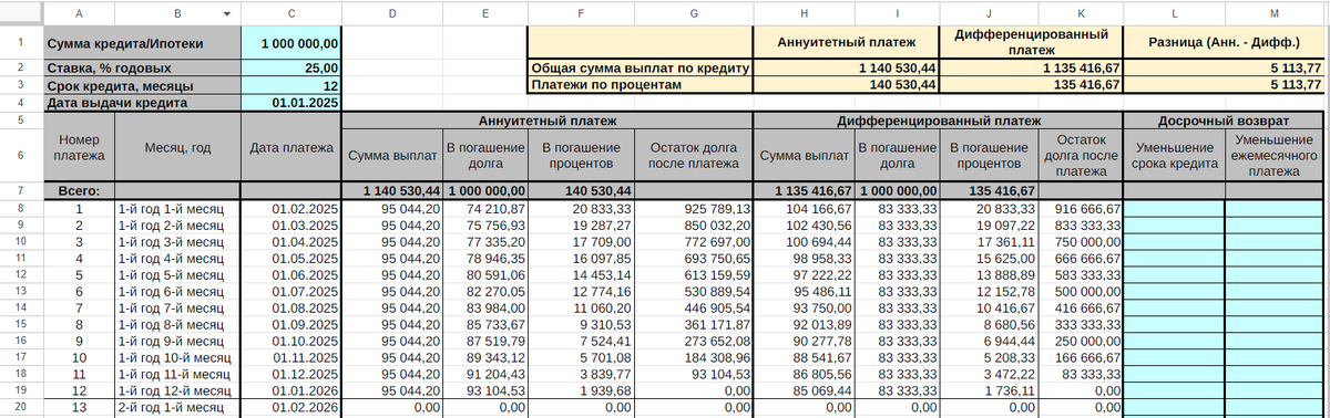 Это лучший калькулятор для расчета и планирования кредитов. Оригинальную таблицу создал Игрь Пустошило, и за это огромное спасибо! Но в ней были обнаружены серьезные ошибки, поэтому я решил доработать документ и сделать расчет полностью правильным! А также я расширил её функционал и добавил несколько полезных ячеек.
