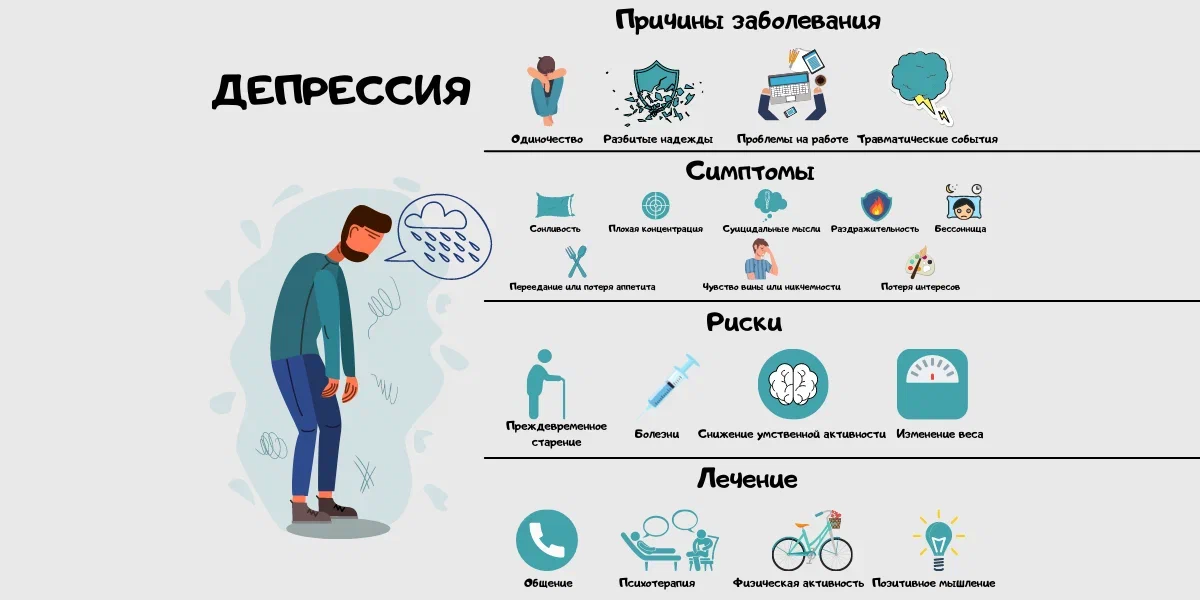 Депрессия — это состояние, при котором человек на длительное время теряет способность радоваться, ощущать жизненную энергию и интерес к окружающему миру. Она сопровождается снижением настроения, упадком сил, проблемами с концентрацией и мыслительной активностью, а также нередко изменениями в аппетите и сне. В отличие от кратковременной грусти или печали, депрессия может существенно нарушать повседневную жизнь человека.