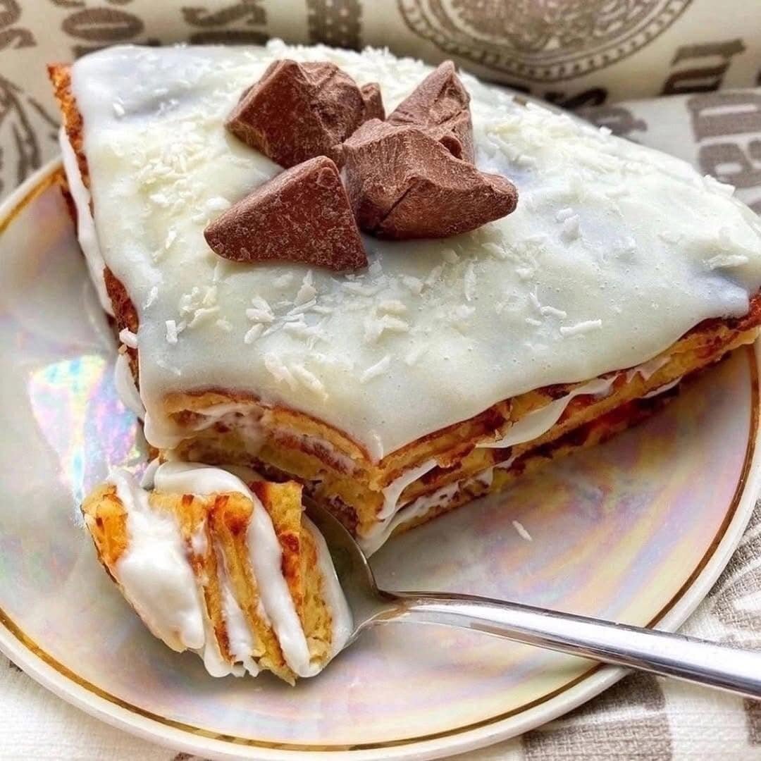 Для коржа: ✔ Яйцо – 1 шт.; ✔ Яблоко среднего размера – 1 шт.; ✔ 2-3 ст. л. овсяной муки; ✔ Заменитель сахара – по вкусу; ✔ Ванилин – пакетик (1-2 г); ✔ Соль – щепотка; ✔ Чуть-чуть разрыхлителя. «Крем»: ✔ 170 г мягкого творога или сметаны; Яблоко натираем на мелкой терке, добавляем все ингредиенты и хорошо перемешиваем. Тесто выливаем разогретую антипригарную на сковороду, и готовим как блинчик. Готовый блинчик разрезаем на 4 части, как пиццу. Собираем торт: Блинчик - мягкий творог - блинчик - и так далее. Можно украсить горьким шоколадом без сахара. КБЖУ на 100 г: 109,5/6,4/4,1/12,8. Рецепт на странице Автор рецепта – Olga Mathisen Расчёт КБЖУ сделан с помощью Telegram-чат-бота https://t.me/vesipitaniebot © Почтенный возраст Online и Рецепты для диабетиков