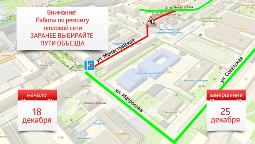 С 18 по 25 декабря в Перми будет закрыт проезд для всех видов транспорта по улице Монастырской в районе Слудской церкви, где подрядчик проведет ремонт бесхозного трубопровода. Для объезда закрытого участка дороги можно будет использовать улицы Матросова, Советскую, Окулова и Крисанова. В мэрии просят водителей быть внимательными при выборе маршрута.