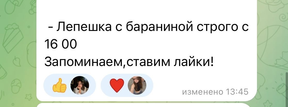 Хохма: 12-го числа в рабочий чат менеджер по-менеджерски отправила распоряжение, согласно коему лепёшки с рваной бараниной подаются исключительно и только («строго») с 16:00, вот пруф: