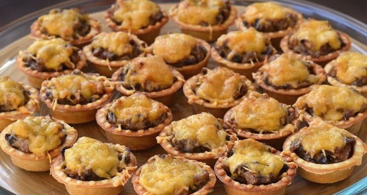 ТАРТАЛЕТКИ С КУРИЦЕЙ, ГРИБАМИ И СЫРОМ. Тарталетки - 20 шт. Филе куриное - 1 шт. Грибы шампиньоны - 250 г Сыр твердый - 50-70 г Лук репчатый - 1 шт. Сливки любой жирности (не домашние) - 50 мл Соль - 3 щепотки Перец черный молотый - 2 щепотки Масло растительное - 30 мл Зелень свежая - для украшения. РУЛЕТЫ ИЗ ЛАВАША Начинки: 1. Крабовые палочки, чеснок, яйцо, тертый сыр, зелень и майонез. 2. Творог, соль, зелень, два зубчика чеснока и несколько ложек майонеза. 3. Жареные шампиньоны с луком, маринованные огурцы, зеленый лук и плавленый сыр, которым нужно смазать лаваш. Все остальные ингредиенты выкладываются слоями. 4. Кусочки красной рыбы, свежий огурец и зелень. Лаваш нужно смазать творожным сыром. 5. Морковь по-корейски, вареное яйцо, тертый плавленый сыр, майонез и укроп. 6. Рыбные консервы в масле размять вилкой, добавить яйцо и зеленый лук. Лаваш смазать майонезом. 7. Адыгейский сыр раскрошить руками, добавить корейскую морковь. Лаваш смазать смесью майонеза и зелени. 8.