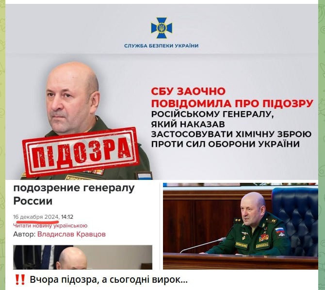 Накануне, за 20 часов до убийства, СБУ заочно направило генералу Кириллову «підозру» (уведомление о подозрении в совершении преступления), практически с теми же формулировками основания. Это не просто слова — такая правовая норма, как «уведомление о подозрении в совершении преступления», существует и в УПК РФ (ст. 223.1). Но то, что за «уведомлением» менее чем через сутки последовала, фактически, показательная казнь путём теракта — весьма характерный факт.