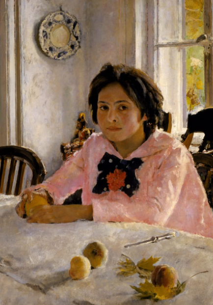 Картина «Девочка с персиками» Валентина Серова, написанная в 1887 году, является выдающимся примером русского портретного искусства. На ней изображена юная Вера Мамонтова, сидящая за столом и держащая в руках яркий желтый персик. Белая скатерть, на которой расположены три персика и нож, создает интимную атмосферу, а свет, проникающий через окно, подчеркивает мягкость и нежность образа.