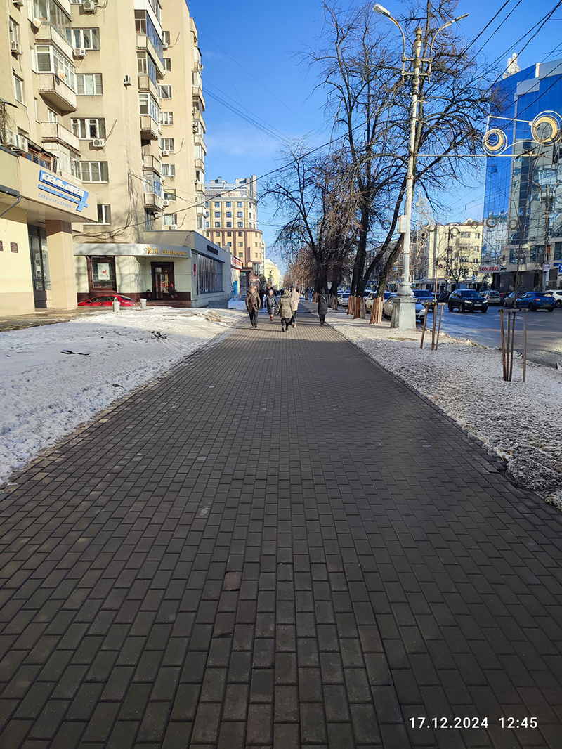 Тротуары убраны кусками, даже там, где убран снег, на плитке остается наледь - из-за скользкости идти очень некомфортно.