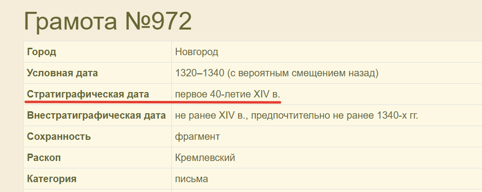 После того, как археологи извлекают берестяные грамоты из раскопов в Новгороде или других городах, начинается самое интересное. Нужно не только развернуть ее и прочитать, но и определить ее так называемую стратиграфическую дату. Этой датой потом в базе данных сопровождается описание найденной грамоты. Выглядит это примерно так: Внестратиграфическая дата может определяться разным способом. В том числе лингвистическим, например. То есть по особенностям написания букв или изменениям в отраженной на письме фонетике. В эту тему мы сейчас вдаваться не будем, хотя она, конечно сама по себе безумно интересна. Но давайте все-таки разберемся, что такое стратиграфическая дата. Тем более, что именно такой способ датировки можно назвать базовым, первичным. Стратиграфия позволяет быстро предположить примерное время написания грамоты. Последующий анализ обычно эту дату подтверждает и уточняет. Очень редко бывают случаи, когда стратиграфия серьезно ошибается. Итак, стратиграфическая дата. В целом, ст