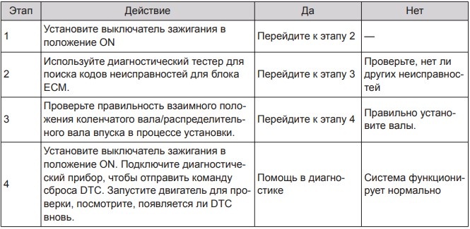 Описание диагностического кода (DTC): неисправность из-за ошибки взаимного расположения коленчатого и распределительного (впуск) валов. Условия появления DTC: абсолютное значение отклонения взаимного расположения коленчатого вала/распределительного вала впускных клапанов в процессе инициализации превысило 10° угла поворота коленчатого вала.