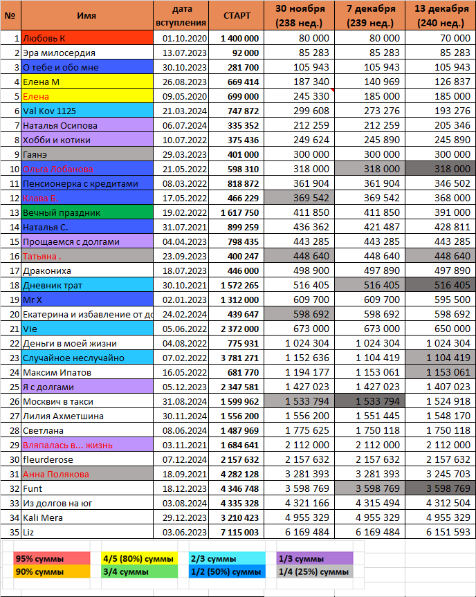 Всем привет! В последнее время мне всё сложнее подступиться к написанию статьи. Знаю, все ждут результатов. Но пока у меня не получается выделить время и сделать за один присест столько действий: заполнить таблицу, наделать скриншоты, ну и конечно, набрать текст публикации. (И так - 52 раза в год. Вот что значит вести марафон!). Приходится делать это урывками, в несколько заходов. Спасибо вам за терпение)) Что ж, перейду к нашим замечательным таблицам. Вначале - общая: Нет, не торопятся пока наши участники покидать марафон. А я уже жду, когда наконец мы запустим салют (виртуально, конечно), провожая кого-нибудь в свободную жизнь без долгов. Что ж, всему свое время. Ну а самые большие суммы на этой неделе погасили следующие участники: Val Kov 1125 погасил 80000 и занял первое место! На втором - Анна Полякова с суммой 35690р, а на третьем - Vie с результатом 23000. Поздравляем! А вот кто погасил больше всех в процентах к своему долгу и занял лидирующие места: Val Kov 1125 и в этой номи