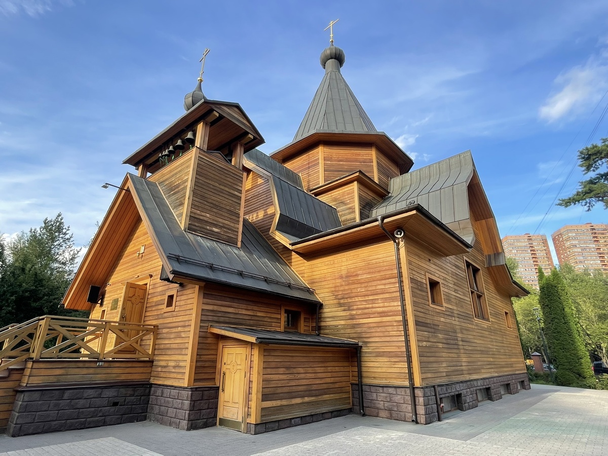 В советское время храм был разрушен, на его месте поставили многоэтажку. Но в 1997 году московские предприниматели решили храм воссоздать. Проект восстановления разработал А.В. Бормотов по сохранившимся чертежам Шехтеля. И появилось в парке Дубки красивая деревянная шатровая церковь храм Святителя Николая Мирликийского. Я очень люблю именно шатровые храмы, для меня они очень русские.