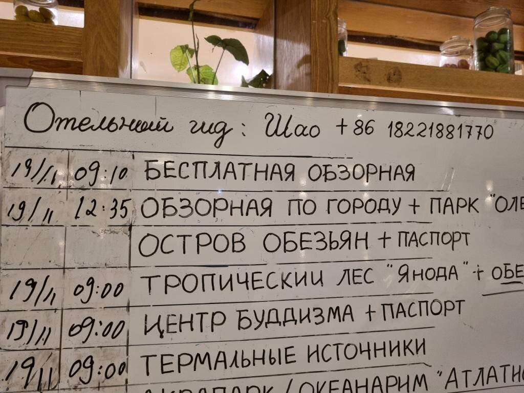 Ценник на мой взгляд просто конский. И это не предел – за сафари и рафтинг хотели 700 юаней и это при том, что дорога занимает 8 часов. Оно нам надо? Не надо. Остров обезьян с подвесной канатной дорогой над морскими цыганами нас тоже не соблазнил. Что мы, обезьян не видели? Дорогу подвесную освоили на Фукуоке в общем неа… Центр буддизма предлагали (Храмовый комплекс Наньшань), но в Таиланде мы храмов уже много осмотрели. Предлагали ужин из морепродуктов по системе «шведский стол» в Дадунхае за 350 юаней. 350 х 15 получаем 5 250, умножаем еще на 2 – знаете, за 10 тысяч рублей я морепродуктов в Красноярске могу поесть. Причем с гарантией, что вкусно будет, наш Красноярск просто столица сибирских гурманов. А тут охренели с ценами ей богу…
