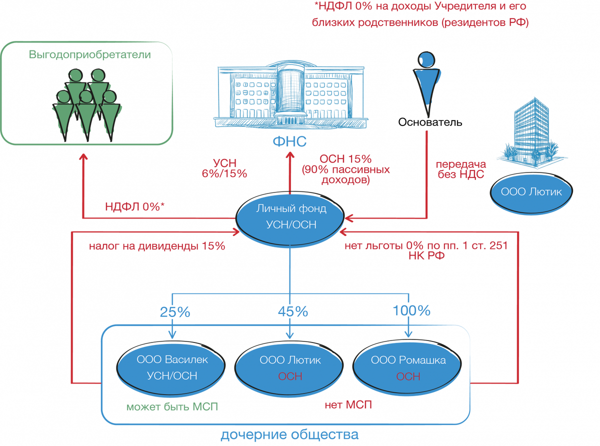 Личный фонд, как новый инструмент наследования бизнеса и активов, проходит постоянную «донастройку» с точки зрения налогообложения. Общий тренд изменений в налогообложении Личных фондов направлен на учет его специфики. Под стать предназначению Личных фондов, налоговый режим стал приближен к налогообложению при личном владении и управлении активами. Иными словами Личный фонд действительно становится все более интересен как инструмент наследования, особенно наследования бизнеса и бизнес-активов. Рассмотрим особенности налогообложения Личных фондов. Личный фонд, как и другие юридические лица, может применять как общую (ОСН), так и упрощенную систему налогообложения (УСН). ■ При применении общей системы налогообложения стандартная ставка - 20% (с 2025 года - 25%). Личный фонд может применять пониженную ставку 15%, если доля «пассивных» доходов более 90%. ■ К «пассивным» доходам относятся, например: - дивиденды; - проценты; - доходы от продажи долей, акций и недвижимости; - доходы от сдачи