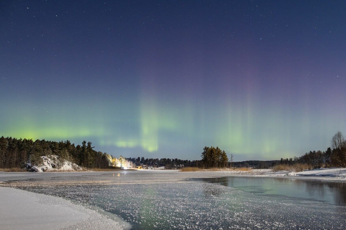 В ночь на 18 декабря на Ладожском озере в Ленинградской области, севернее Приозерска, было замечено северное сияние. Фотографии и видео появились в телеграм-канале «АстроФотоБолото». «Не только световой лес сегодня был замечен, в Ленобласти и соседних регионах, но и северное сияние немного посияло, никаких бурь, все прошло в штатном режиме. Ленты и столбики над северным горизонтом, но яркие, даже почти полная луна не смогла испортить шоу», – говорят авторы. Отметим, сияние длилось около получаса, при температуре минус 22 градуса. Ранее сообщалось, что световые столбы заметили в Петербурге.