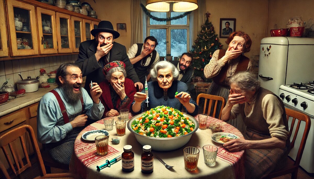 Новый год 2016-го в нашей коммуналке начался, как обычно: шумно, весело, с тазиком оливье в центре стола. Всё шло как по маслу, пока один неожиданный «ингредиент» не стал героем вечера. – Галя, ну шо у нас с салатом? – спросила Люся, заглядывая в миску, где покоилось наше фирменное оливье. – Всё как всегда: картошка, яйца, горошек, майонез и душа, – ответила я, добавляя последние штрихи. И вот, к полуночи салат был торжественно выставлен на стол. Все набросились на него с ложками, чокаясь компотом и шампанским. Но вдруг... – Стоп! Шо это?! – раздался возмущённый крик Валентины Петровны, которая неожиданно выловила из своей тарелки что-то подозрительное. Все замерли. На ложке у Валентины Петровны лежал… пластиковый колпачок от шприца. – Это шо, шутка такая? Кто подложил в салат игрушку? – строго спросила она, глядя на всех, как прокурор в зале суда. – Может, это сюрприз? Типа, как монетку в пирог, только... неудачный? – предположил Гриша, но тут же получил строгий взгляд от Люси. – Сюрп