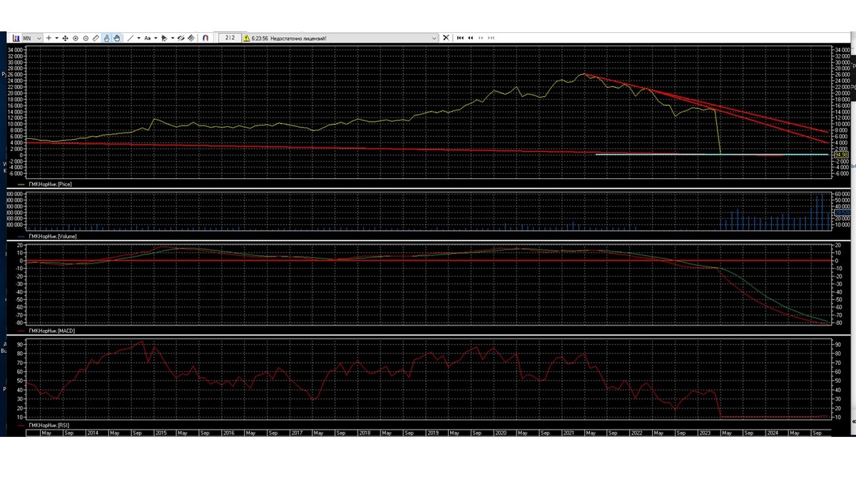 Месячный график показывает, что акция ГМКНорНик, после дробление в 2023 году резко ушла вниз и продолжает медленно двигаться вниз.