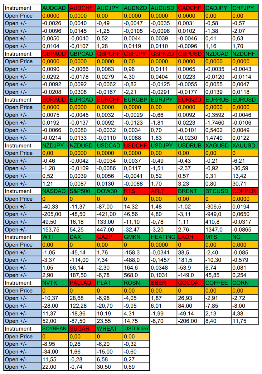 Весь перечень анализируемых активов указан ниже в общем количестве 60 инструментов. Здесь Вы найдете активы рынка Форекс, популярные активы Московской биржи, не менее популярные активы Чикагской биржи СМЕ и мажор криптовалютного сегмента - Биткоин, за которым следуют все альткоины.