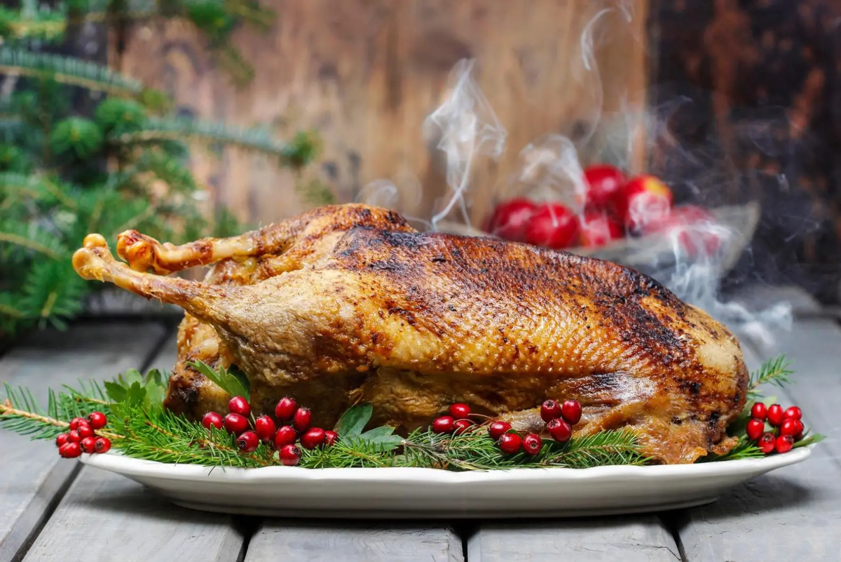 3) если есть большая сковорода, то лучше гуся сначала обжарить до корочки на сильном огне