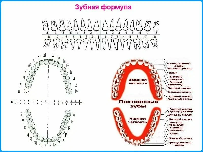 Не на пальцах же😄 нашла зубное фото, и мне стало за одну минуту понятно, что зубы наши подразделяются на верхнюю и нижнюю челюсть (да ладно?😄), и в разные стороны от одного до восьми, что в сумме даёт 32 зуба, и это конечно идеальный вариант.