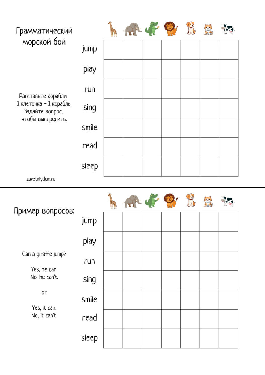 Сегодня еще один способ поиграть в английский и потренировать речь - игра Грамматический морской бой. Расставляем кораблики (можно однопалубные) и начинаем "стрелять". Стреляем вопросами. Например: Can a giraffe smile? или Is the giraffe smiling? или Does a giraffe like to smile? отвечаем Да или Нет в соответствующей конструкции. Заветный дом