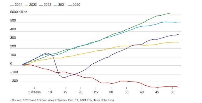 Инвестиции в облигации достигли рекордных уровней на фоне высокой доходности и такой же высокой неопределенности Инвестиции в облигации по годам. Источник: Reuters В этом году инвесторы вложили рекордные $600 млрд в мировые облигационные фонды. Их привлекает самая высокая за последние десятилетия доходность, возникшая перед неопределенным 2025 годом. Снижение инфляции позволило центральным банкам начать смягчение денежно-кредитной политики. Инвесторы спешат зафиксировать высокую доходность — это особенно важно после того, как в 2022 году из фондов с фиксированным доходом ушло $250 млрд. «Главное — это доход, — говорит Василики Пачатуриди, глава стратегии по инструментам с фиксированным доходом в регионе EMEA в BlackRock. — Мы видим, как доходность возвращается в облигации. Таких уровней мы не наблюдали почти 20 лет». Доходность облигаций обычно падает, а цены растут, когда центральные банки снижают краткосрочные ставки по займам. В этом году доходность глобального облигационного индекс