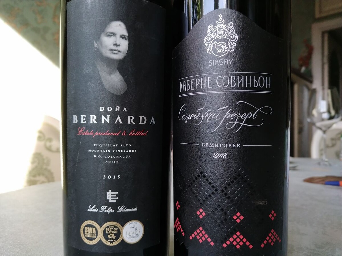 Чилийское вино Dona Bernarda долго продавалось в "Красном и белом", пока вся не продалась. Это было лучшее вино сети, на неё даже скидок не было, цена и так была ниже, чем в других местах. Продавалась поэтому долго, а вся продалась, потому что при выводе из ассортимента скидки таки начались: с 2 тысяч рублей сначала сползли до 1800, потом опустились до 1600, а затем и вовсе упали, говорят, ажно до 1350 рублей в некоторых отдалённых и мало проходных магазинах. При мировой цене 25-30 евро просто прекрасно. Я застал этот праздник жизни на первых этапах, и сегодня в сравнении участвует бутылка Dona Bernarda из каберне-совиньона, сиры и карменера 2018 года. Да не одна. Ещё одно вино 2018 года - кубанское "Семейный резерв" от "Имения Сикоры" из каберне-совиньона, обычно продающееся в Simple за 3,2 тысячи, но бывает со скидками до 50%, как мне и досталось. Итого получилось: одинаковая цена, одинаковый сорт, одинаковый год у чилийского и российского вина. Срои розлива, правда, разные. Март 202