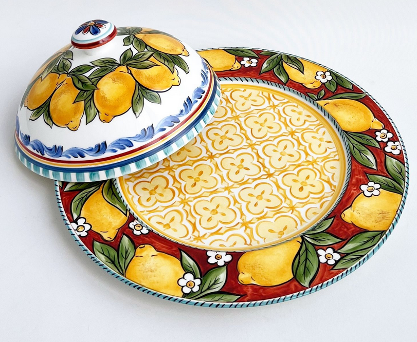 Микс лимонов и этнического средиземноморского орнамента. Тарелка - диаметр 30 см, колпак - 20 см. Фарфор.