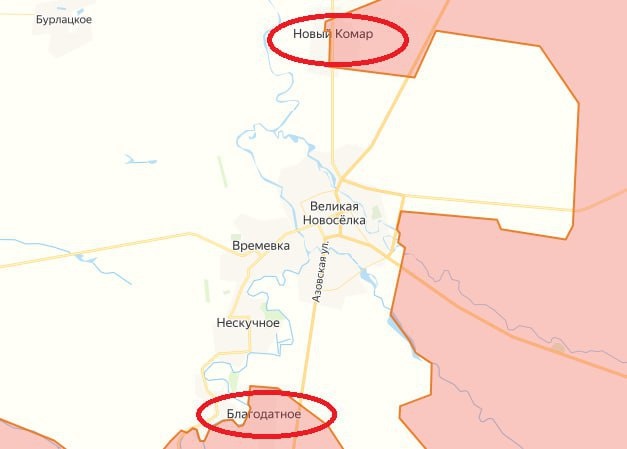 ◾️Основные бои продолжались в поселке Новый Комар, откуда постепенно вытесняется украинский гарнизон. ◾️В районе Сторожевого и по холмам, что западнее данного района, также идет наступление российских штурмовых групп. ◾️Гарнизон ВСУ в Великой Новосёлке фактически находится в оперативном окружении.