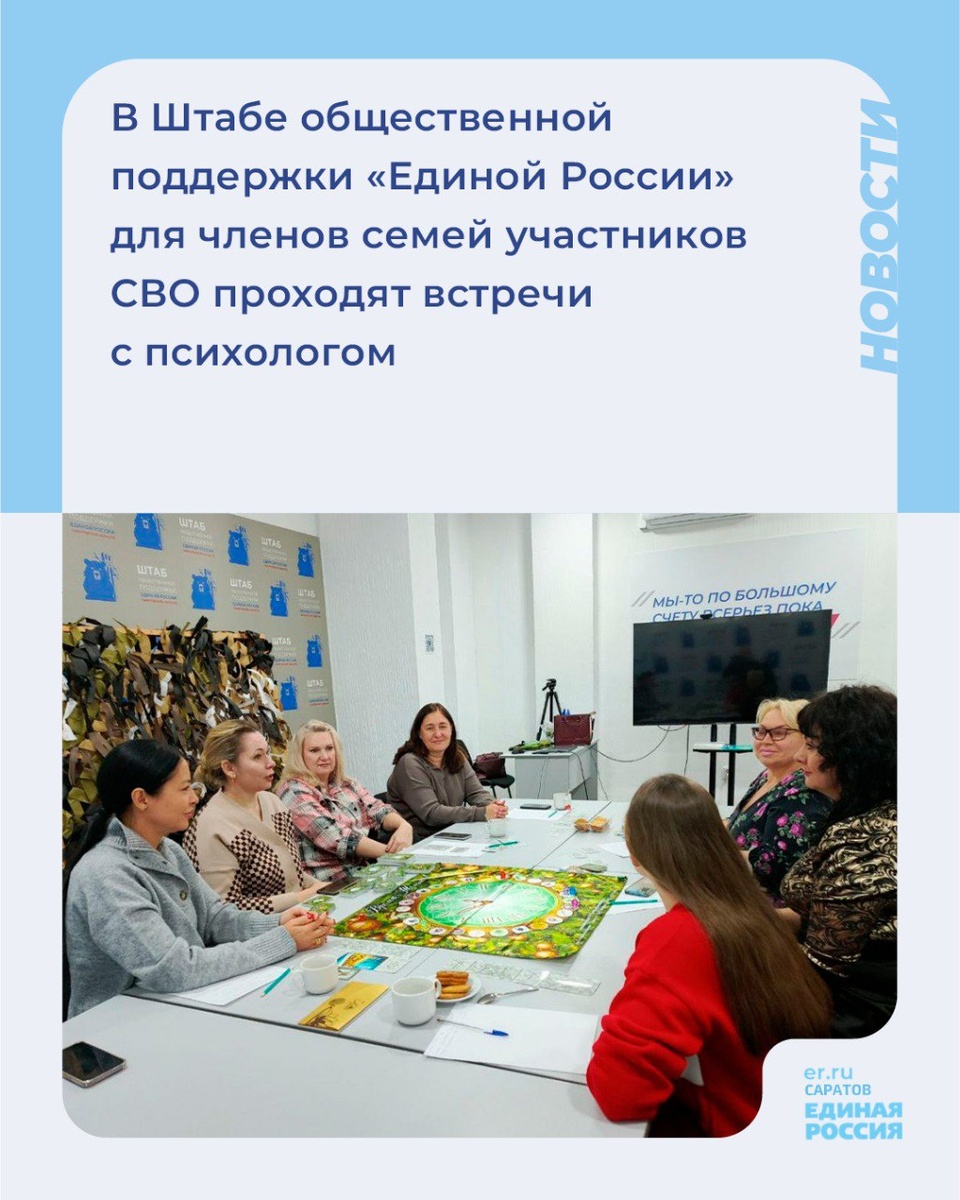 В Штабе общественной поддержки «Единой России» для членов семей участников СВО проходят встречи с психологом 🇷🇺На площадке Штаба проходят мероприятия по оказанию всесторонней поддержки участникам специальной военной операции и членам их семей Проект оказания психологической поддержки участникам СВО и членам их семей реализуется с июня 2024 года. Проведение серии встреч с психологами приурочено к Году семьи в России. 🫂Тематические мероприятия членов семей бойцов СВО с участием команды психологов организованы в рамках реализации федерального проекта «Крепкая семья» партии «Единая Россия». Специалисты показывают родным наших бойцов лучшие практики, проводят индивидуальные консультации. На групповых семейных занятиях отрабатываются психологические техники. Также, проходят индивидуальные семейные консультации. 💬«Все приемы у специалистов проходят конфиденциально. Родные наших защитников сегодня особенно нуждаются в такой поддержке. Поэтому люди с особым желанием и охотой обраща