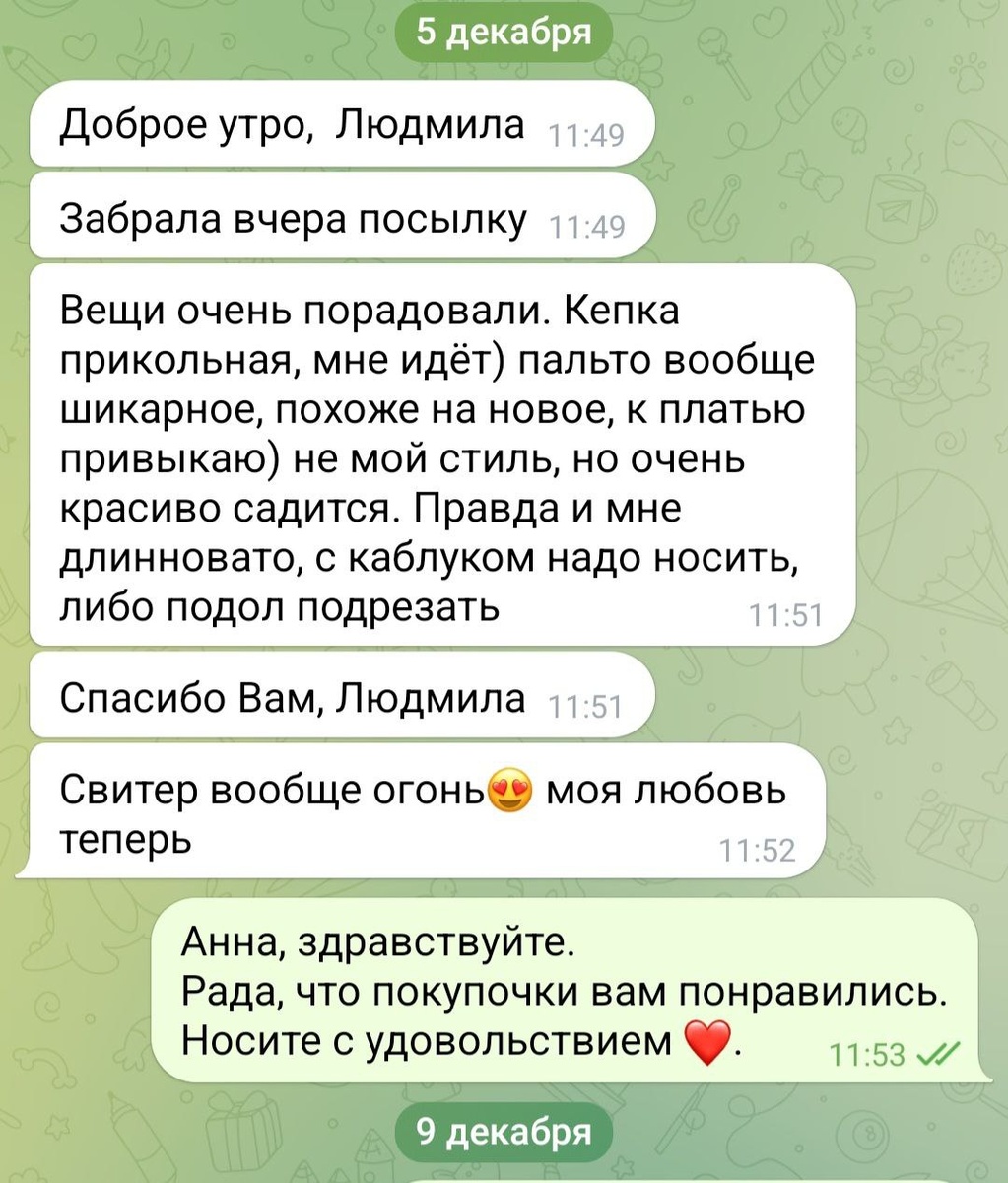 Приветствую Вас, мои дорогие подписчики. А если Вы таковыми ещё не являетесь, то скорее подписывайтесь на мой канал в Дзен и телеграм👇 чтобы всегда быть в курсе появления новых интересных вещей и успеть их приобрести для себя или своих близких. Бывает ли у вас такое? Думаешь, взять эту вещь или не взять? Нужна она мне или не нужна? С чем носить? Подходит ли мне такой цвет/фасон и т.д. Думаю, что бывает. А у меня этот вопрос возникает всегда, так как хочется приобрести такие вещи, которые будут востребованы и приносить радость свои новым хозяевам. Ведь как приятно читать отзывы от своих покупателей и понимать, что помогаешь и приносишь пользу. Для меня это один из главных критериев в данном виде деятельности, да и вообще в любой работе. Мои дорогие подписчики, спасибо вам за доверие ко мне, за активное участие в работе моего канала, за покупки и, конечно же, за приятные отзывы. Часто сталкиваюсь с тем, что не взяла какую-то вещь, а она понравилась многим. Вернуться за ней уже не по
