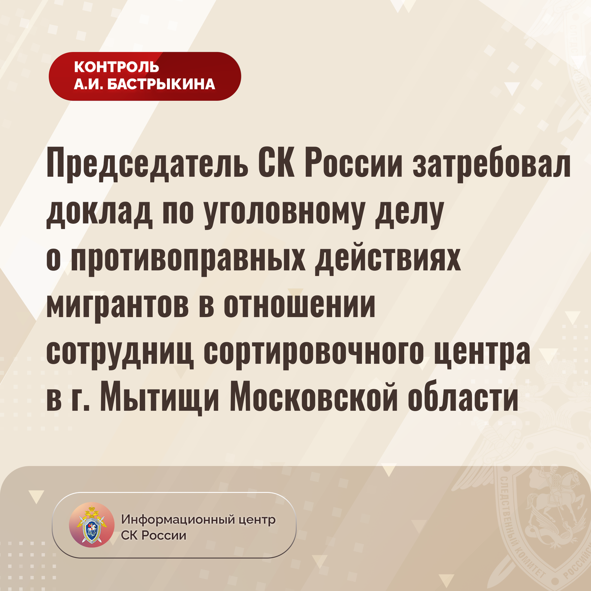 Председатель СК России затребовал доклад по уголовному делу о противоправных действиях мигрантов в отношении сотрудниц сортировочного центра в г. Мытищи Московской области В телеграм-канале сообщается о совершении мигрантами противоправных действий в отношении сотрудниц сортировочного центра одной из компаний в городе Мытищи Московской области. Фигуранты, также осуществляющие трудовую деятельность в организации, преследуют женщин, понуждая к действиям сексуального характера, а также высказывают в их адрес угрозы. Многочисленные обращения к руководству результатов не приносят, жалобы пострадавших игнорируются. В ГСУ СК России по Московской области по данному факту возбуждено уголовное дело. Председатель Следственного комитета Российской Федерации Александр Иванович Бастрыкин затребовал у и.о. руководителя ГСУ СК России по Московской области Ярослава Александровича Яковлева доклад о предварительных и окончательных результатах расследования уголовного дела. Исполнение поручения поставлен
