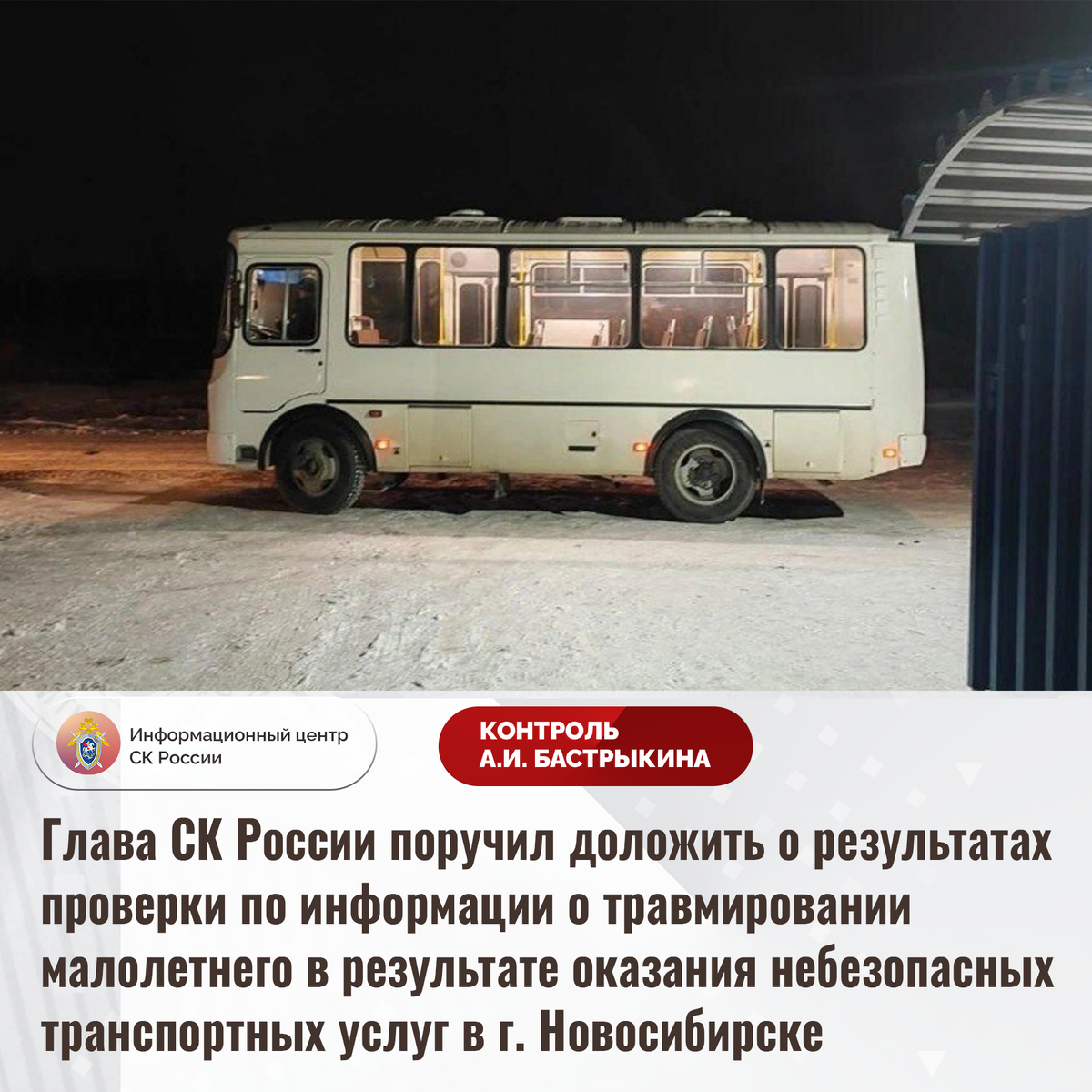 Глава СК России поручил доложить о результатах проверки по информации о травмировании малолетнего в результате оказания небезопасных транспортных услуг в г. Новосибирске В СМИ сообщается, что 17 декабря текущего года в городе Новосибирске водитель автобуса, не убедившись в окончании посадки и высадки пассажиров на остановочном павильоне, начал движение, совершив наезд на девятилетнего мальчика, который поскользнулся и упал перед транспортным средством. Пострадавшего госпитализировали. В СУ СК России по Новосибирской области по данному факту организована процессуальная проверка. Председатель Следственного комитета Российской Федерации Александр Иванович Бастрыкин поручил и.о. руководителя СУ СК России по Новосибирской области Антону Николаевичу Бадулину доложить об установленных в ходе первоначальных проверочных мероприятий обстоятельствах, а по завершении проверки – о ее результатах. Исполнение поручения, а также ход процессуальной проверки поставлены на контроль в центральном аппарат