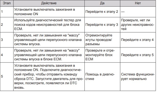Описание диагностического кода (DTC): низкое напряжение в управляющей цепи перепускного клапана системы впуска. Условия возникновения кода неисправности: ошибка в ходе самодиагностики.