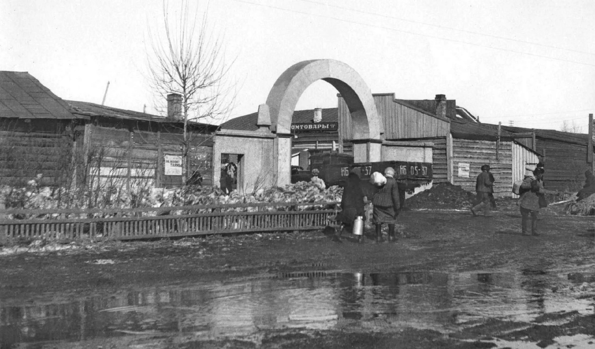 Интересная фотография .Есть мнение, что этот снимок сделан весной 1949 года на Ипподромском (Центральном) рынке. На афише "Вас вызывает Таймыр" - эту пьесу стали ставить в региональных театрах позднее мая 1948 года. Но, судя по погоде, на снимке март или апрель, значит, это 1949, максимум 1950 год.
