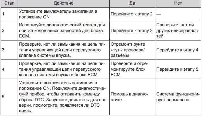 Описание диагностического кода (DTC): повышенное напряжение в управляющей цепи перепускного клапана системы впуска. Условия возникновения кода неисправности: ошибка в ходе самодиагностики.