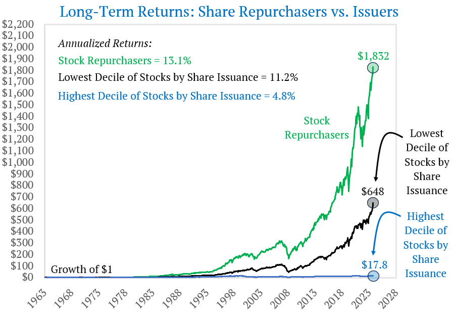 Покупаем акции с "байбеками" и радуемся профиту! За графиками и буковками на иллюстрации стоит простая мысль: статистически акции, которые выкупают свои акции (делают байбеки) показывают более высокую доходность. А акции, которые выпускают акции (размывают акционерный капитал) уступают по доходности. При этом доходность все же есть: даже "размыватели" за 60 лет превратили 1$ почти в 18$. Но согласитесь 1832$ или рост в 1832 раза - выглядит поприятнее? Понятно, что как и в случае с другими параметрами фундаментального анализа, нельзя покупать акциию ТОЛЬКО на основании того, что компания делает байбеки. Как и статус "дивидендного аристократа" сам по себе не гарантирует высокие доходности и качество акции, так и байбеки - лишь один из параметров выбора бумаг. Но все же, это очень важный параметр! И что точно можно сказать: если компания активно ЭМИТИРУЕТ акции - у нее, скорее всего, не все благополучно. Если хотите наглядный пример из российского рынка - гляньте на банк ВТБ... @knyazevi