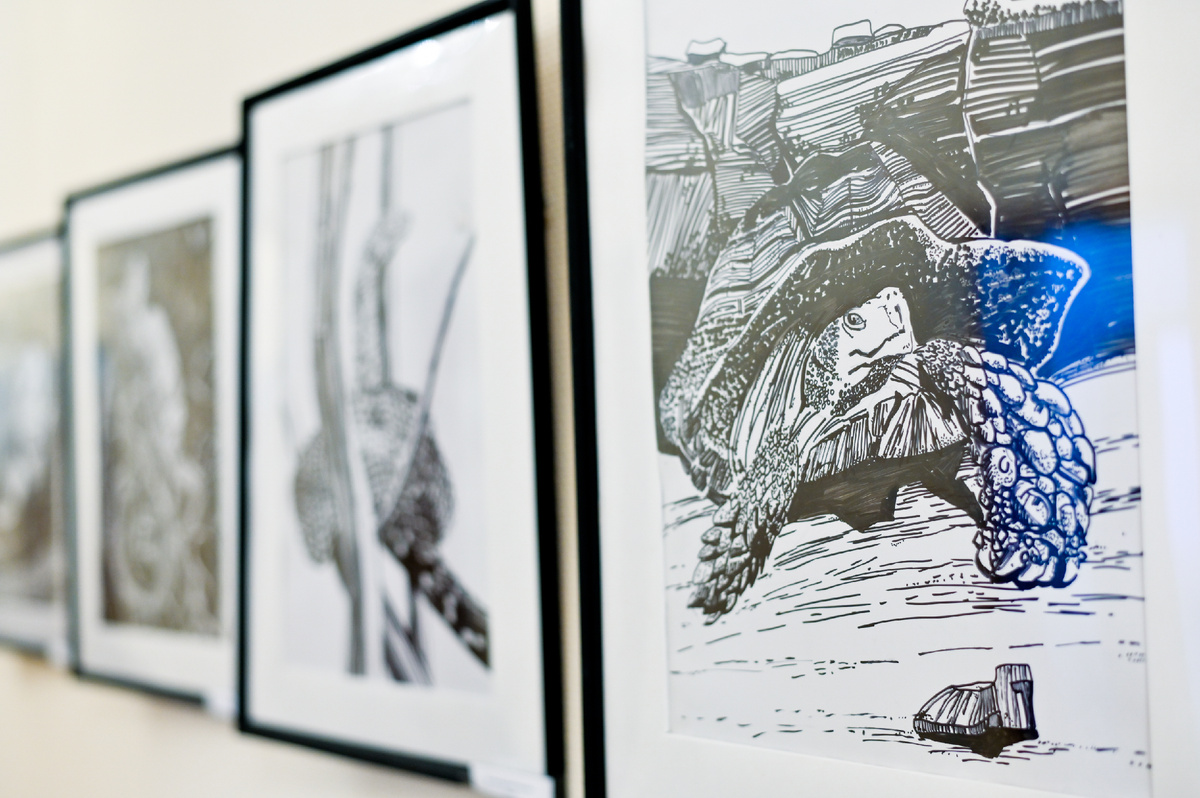 Настоящий мир удивительной живой природы возник в библиотеке благодаря художественным работам Ольги Викторовны Косяковой (Тайченачевой). На выставке «Прогулка по зоопарку» нашли отражение наблюдения за животными Ленинградского и Красноярского зоопарков. Любовь к творчеству и рукоделию художнице привила мама, Вера Степановна – архитектор. Ольга окончила художественную школу им. В. И. Сурикова с красны дипломом и «похвалой». Художница особенно талантлива в создании иллюстраций и быстрых зарисовках. Ольга Викторовна принимала участие в выставках, творческих проектах, выпустила несколько настольных календарей. Рисование маркером позволяет очень точно передавать загадочность и грацию животных. В идеально прорисованных мельчайших деталях и линиях скрываются терпение, внимание и мастерство художника. Тщательная каллиграфическая проработка деталей дает почувствовать настроение и эмоции животных, их характер. Вот мимо проплывает грустная задумчивая рыба, а вот рядом примостились на ветках бесст