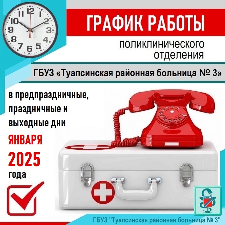В предстоящие предпраздничные, праздничные, выходные и нерабочие дни, наша поликлиника будет осуществлять работу по оказанию неотложной медицинской помощи - ежедневно (29.12.2024 - 8.01.2025) с 8 до 19 часов. Вызвать бригаду скорой медицинской помощи можно по телефону: 03 - для стационарных телефонов; 103 - для мобильных телефонов; 112 - единый номер. 3 и 4 января 2025 года с 8 до 16 часов в нашей поликлинике будет принимать врач-терапевт. Справки по телефону регистратуры поликлиники 8(86167)7-13-14. Подробнее на нашем сайте: https://hosp23.ru/patients/345.html