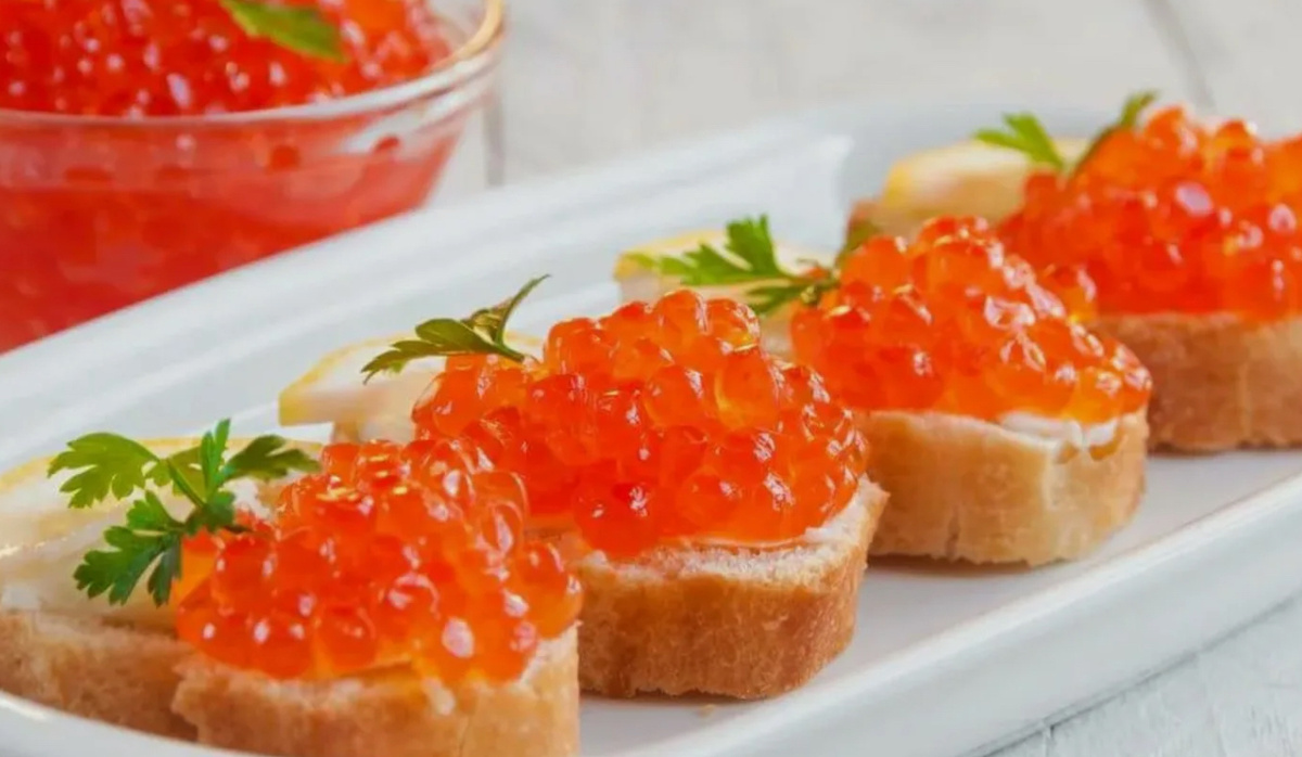 - На каждый ломтик выложите по половине столовой ложки красной икры.