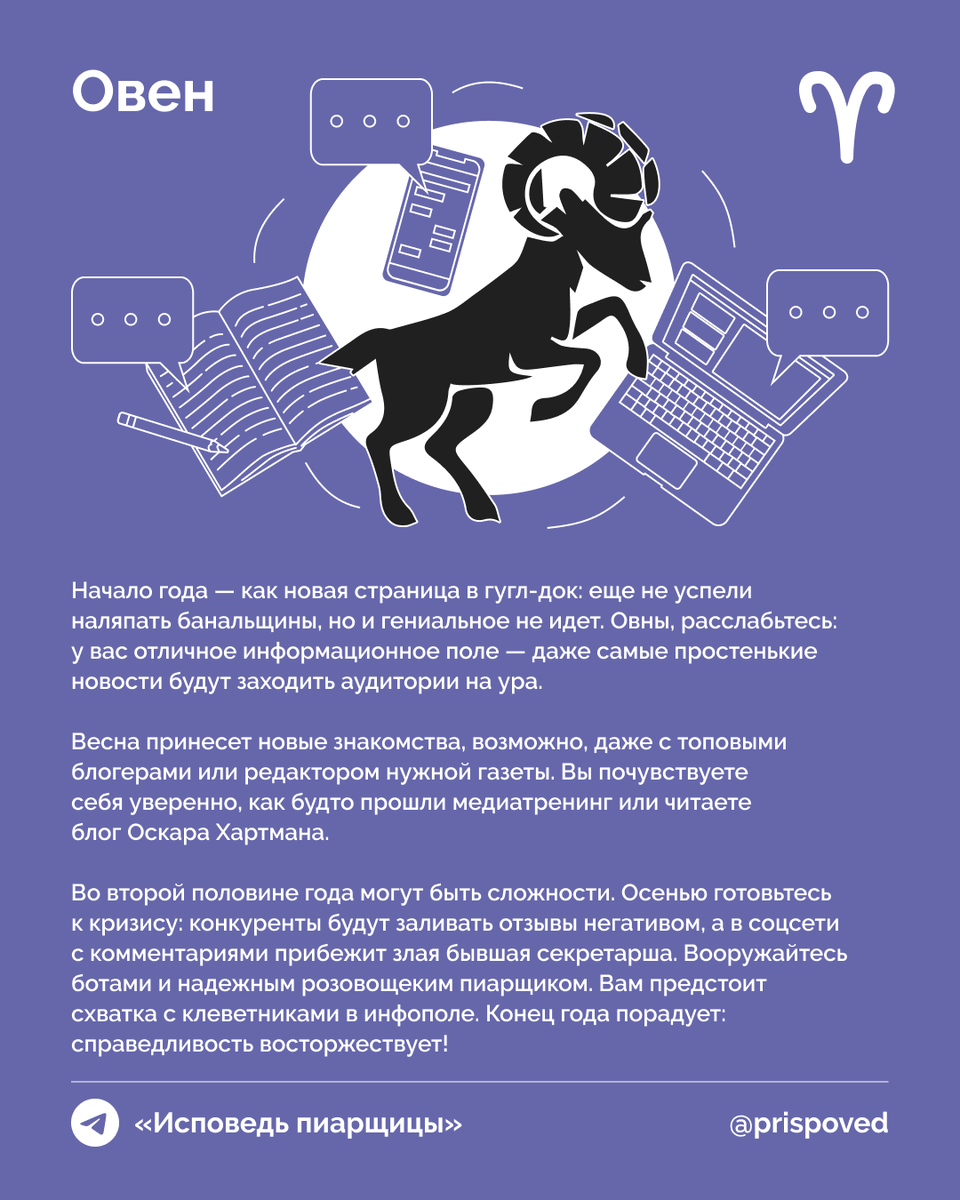 Телеграм-канал «Исповедь пиарщицы» и LED PR подготовили PR-гороскоп на 2025 год для всех знаков зодиака. Рекомендуем планировать свою медийную активность, ориентируясь на здравый смысл и нашим советы.