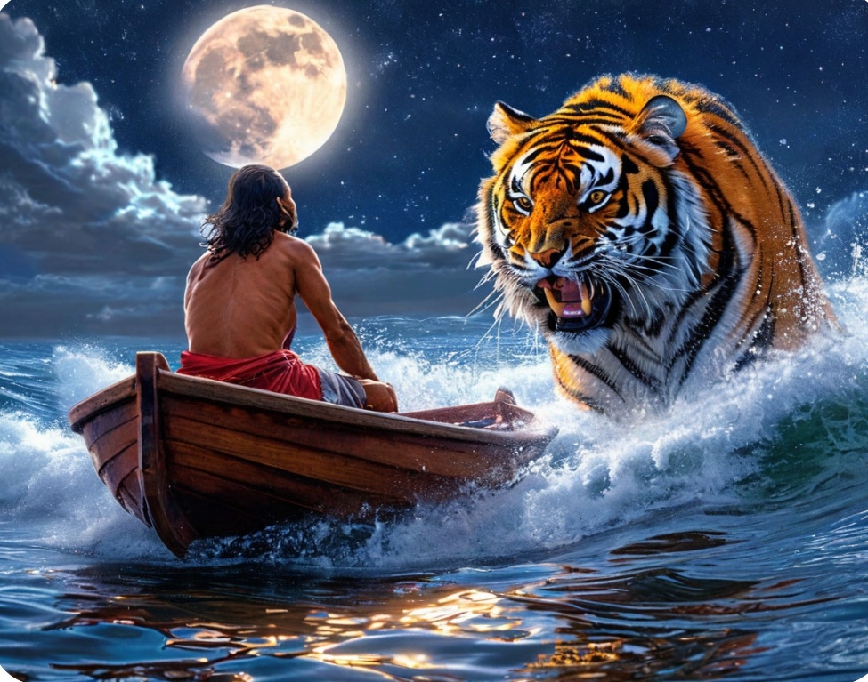 Шлюпка качалась на волнах, словно игрушечный кораблик в бушующем море. Луна, огромный бледный глаз в черном небе, лилась холодным светом, освещая лицо Пи и мокрую шерсть Ричарда Паркера. Тигр, обычно полный царственного достоинства, сидел на краю лодки, понурившись, как обиженный котёнок. Волны стали выше, шлюпка резче качнулась. Ричард Паркер попытался взобраться на борт, но поскользнулся на мокрых досках. Он издал низкий рык, скорее от разочарования, чем от злости. — Боже… он испуган… такой большой, такой сильный… а испуган, как ребёнок… я вижу это в его глазах… в этих диких, мокрых, блестящих глазах… это больше, чем просто животное… это… другой… Пи посмотрел на него. В темноте глаза тигра сверкали ярко, но в них не было хищнического блеска. Только жалость, испуг, и глубокое смирение. Пи понял: это больше, чем просто тигр. Это живое существо, истощенное голодом и усталостью, находящееся на грани срыва. Он видел в его глазах отражение своей собственной беззащитности перед стихией. —