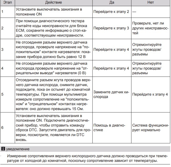 Описание диагностического кода (DTC): неисправность нагревателя верхнего датчика кислорода. Условия появления DTC: текущий показатель внутреннего сопротивления превышает пороговую величину.