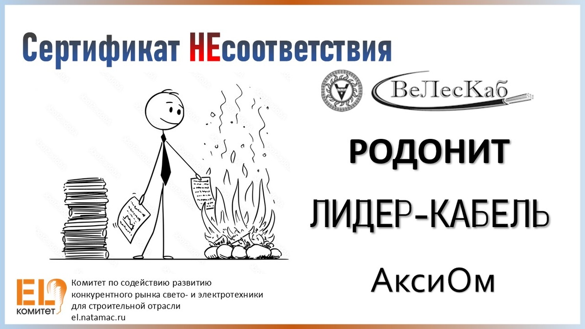 Сертификат НЕсоответствия. ВЕЛЕСКАБ. РОДОНИТ. ЛИДЕР КАБЕЛЬ. АКСИОМ.